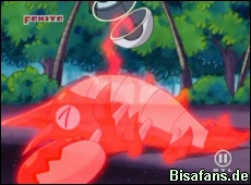 Es dauert sehr lange bis Krebscorps sich mit einem Blubber rührt, doch dann legt Geckarbor mit einem Ruckzuckhieb los und trifft Krebscorps voll. Der anschließende Pokeball von Ash kann dann das Krebscorps problemlos fangen!
