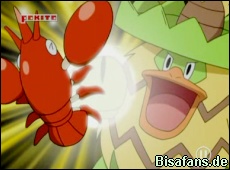 Ash und Poncho einigen sich auf einen Pokémon-Kampf mit den Sandwiches als Einsatz! Eigentlich wollte Ash ja Reptain einsetzen, doch Krebscorps drängelt sich vor und überzeugt Ash davon teilnehmen zu dürfen. So treten also Krebscorps und Kappalores gegeneinander an... Krebscorps Blubbstrahl verpufft jedoch an Kappalores starker Abwehr und gegen den Krabbhammer weicht Kappalores mit Doppelteam aus. Es sieht alles andere als gut aus für Ash. Als Kappalores seinen Hyperstrahl einsetzt geht Krebscorps schließlich K.O. und Poncho gewinnt alle Sandwiches :(