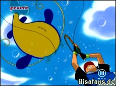 Während Ash über das kleine Karpador lacht, beißt auch bei Ash etwas an. Wie sich zeigt, hat Ash nun Nero an der Angel. Dieses wehrt sich und zieht das Boot, aus dem alle angeln, hinter sich her. Ash will aber nicht aufgeben und läßt sein Krebscorps sich selbst mit einem Krabbhammer angreifen um sich an Land zu katapultieren. Durch den Schwung kann er auch Nero an Land schleudern und mit Reptains Hilfe muss Welsar kurz darauf die Orden fast rausrücken... Fast, weil nun Team Rocket mal wieder auftaucht um sich ebenfalls das riesige Welsar Nero zu schnappen. So fliegen diese mit ihrem Heißluftballon und dem gefangenen Welsar davon.
