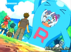 Eine Störung gibt es zwischenzeitlich nur durch Team Rocket, die das Lager unserer Freunde entdecken und mit ihrem Woingenau-Ballon-Roboter das Essen sowie Pokémon klauen wollen. Maike stellt sich ihnen mit Evoli in den Weg und macht ein Loch in den Ballon, bis dieser davonfliegt.