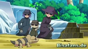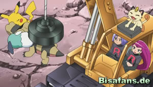 Wenige Schritte später fallen Ash und Lilia schmerzhaft in eine Fallgrube. Diese stammt diesmal jedoch nicht von Team Rocket. Bevor die Sache weiter erklärt wird, gibt es einen Szenenwechsel, bei dem auch Team Rocket in eine Grube fällt und dabei ein Ganovil mit Brille finden.