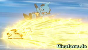 Zwischenzeitlich kann sich Team Rocket ungesehen in das Vorratslager eindringen und macht sich über die sich dort befindenen Güter her. Statt aber die erhofften Vorräte zu finden, stößt James doch tatsächlich über Ashs Freund Pikachu, noch immer von Ottaros nicht bös gemeinten Angriff besinnungslos. Über diesen Fund sehr zufrieden verlassen Jessie und James mit Pikachu in Gewahrsam das Lager, werden aber daraufhin von Ash, Lilia Don George und seinen Mannen gestellt. Mit Pikachu verschwunden und Ottaro völlig von der Rolle erkennt Ash schnell den Ernst der Lage und ergreift die Initiative. Die befohlene Aquaknarre durch Ottaro bleibt aber dank eines Schutzschildes durch eine technische Spielerei Team Rockets ohne sichtlichen Schaden. Floink allerdings gelingt es, die Schutzbarriere durch eine feurige Glutattacke zu durchbrechen und ermöglicht Pikachu somit die Flucht. Doch auch Team Rocket kann ein weiteres Mal entkommen, was angesichts der Befreiung Pikachus aber nicht weiter tragisch erscheint. Außerdem entschließt sich Floink, aus Dankbarkeit Ash gegenüber, diesen von nun an bei seiner Reise zu begleiten. Mit der geballten Kraft des kleinen Feuerpokémons setzt Ash seine Reise fort, sein Ziel klar vor Augen – die Arena von Orion City.