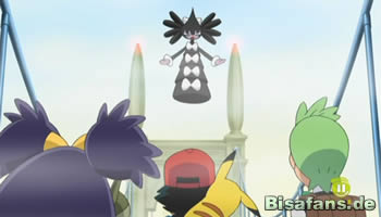 Trotz der immer spärlicher werdenden Sicht, bahnen sie sich ihren Weg unaufhaltsam voran. Doch ein jäher violetter Lichtstrahl erschüttert urplötzlich das friedliche Beisammensein der Freunde. Aus dem Himmel erhebt sich ein scheinbar in ein schwarzes Kleid gehülltes, fast mannshohes Pokémon, welches der Pokédex als ein Morbitesse identifizieren kann. Mit einem bedrohlichen Funkeln in den Augen versperrt es ihnen den Weg. Auf die Anfrage, doch bitte den Weg freizumachen, reagiert Morbitesse stur und feuert ihnen erneut einen zerstörerischen Psystrahl entgegen. Ein Kampf zwischen dem Psycho-Pokémon und Ashs Pokémon Serpifeu bricht aus. Attacken werden pariert oder prallen aufeinander. Im Höhepunkt des Gefechts wird plötzlich die ganze Umgebung in ein gleißendes Licht gehüllt, der Boden scheint unter den Füßen von Ash, Benny, Lilia, Milza, Pikachu und Serpifeu einzubrechen, man stürzt tiefer und immer tiefer, die Umgebung verblasst.
