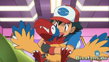 Zwischenzeitlich haben Professor Esche, Vivian und ihre jungen Besucher mit dem lebhaften Flapteryx-Weibchen alle Hände voll zu tun. Das Essen der Neuzeit bekommt Flapteryx nicht, weitere Mark und Bein erschütternde Schreie entrinnen immer wieder ihren Stimmbändern und der verlockende Ruf des Himmels erreicht das Ohr des gefiederten Pokémons. Flapteryx gilt, so meint Professor Esche, als der Urahn aller Flug-Pokémon, obwohl diese Spezies es niemals gelernt hat, die unförmigen Schwingen zum Fliegen einzusetzen. Nach etlichen Versuchen und die daraus resultierenden Bruchlandungen, bei denen Ashs Partnerin Navitaub als geschulte Lehrmeisterin fungiert und ihrem Lehrling immer wieder auf die Füße hilft, schafft es Flapteryx aber dann doch, die Schwerkraft für einige Sekunden zu überwinden und sämtliche Zweifler zum Stocken zu bringen. Überglücklich, einen großen Schritt in Richtung der nahezu unendlichen Freiheit getan zu haben, stimmt Flapteryx in einen erneuten ihrer betäubenden Schreie ein – und natürlich freut man sich für sie, auch wenn die Trommelfelle bereits zum Zerreisen gespannt sind. Überschattet wird dieses fröhliche Ereignis allerdings von den Vorfällen, die sich in der Zwischenzeit im Inneren des Labors abgespielt haben. Das komplette Innenleben wie auch Großteile des Dachs und der Fassade des Forschungsinstituts sind, während der im Außenbereich stattgefundenen Flugstunden, von einer fremden Pflanze überwuchert und mit jedem Schrei, der Flapteryx’ Rachen entrinnt, scheint das Gewächs, an dessen Zweigen bereits unzählige Früchte wachsen und gedeihen, immer höher zu sprießen. Professor Esches These ist es, dass bei Flapteryx’ Wiederbelebung wohl zeitgleich die Keimlinge dieses Gewächses, die wohl in dem Fossil verborgen waren, eine Wiederauferstehung durchlebt haben. Das Resultat ist sichtlich beeindruckend. Insbesondere aber Flapteryx ist von dem prähistorischen Baum hin und weg und kann sich – insbesondere an den süßen Früchten – gar nicht satt genug sehen. Aus dem Staunen kommen die Menschen aber erst gar nicht heraus: Während sich Flapteryx eine Frucht nach der nächsten genehmigt, beginnt urplötzlich das regenbogenfarbene Federkleid des Flug-Pokémons hell zu leuchten. Flapteryx wird von einem gleißenden Licht verschluckt – zum Vorschein kommt völlig unerwartet Aeropteryx, Flapteryx’ Weiterentwicklung. Ihre mächtigen Schwingen schlagen eine tiefe Bresche in die Luft und tragen Aeropteryx mühelos zu ihrer Fluglehrerin, Navitaub, in den Himmel empor.