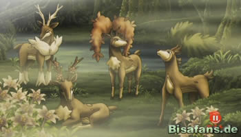 Gelähmt von den todbringenden Pollen und unter Fieber leidend ist Robert auf Ashs Hilfe angewiesen und muss sich notgedrungen von ihm den ganzen Weg zurück tragen lassen. Der Schweiß rinnt in Strömen, Roberts Fieber dagegen steigt kontinuierlich. Zu allem Überfluss wird man abermals von dem tückischen Nebel dieser Gegend überrascht und sieht, ehe man es sich versieht, noch nicht einmal mehr die Hand vor Augen. Die Lage scheint hoffnungslos, als plötzlich wie aus dem Nichts das Sesokitz, mit dem man erst vor kurzem Freundschaft geschlossen hat, mit einem ausgewachsenen Kronjuwild auftaucht und den verirrten Wanderern neuen Mut spenden. Mit unmissverständlichen Posen gestikulieren die Jahreszeit-Pokémon den beiden Menschen, ihnen zu folgen. Nach kurzem Fußmarsch – Roberts Zustand hat sich nicht zum Besseren gewendet und ihn zwischenzeitlich seines Wachzustandes beraubt – erreicht man das völlig überschattete Herz und Heiligtum des Waldes: eine Quelle, die sich bei näherer Betrachtung haargenau mit der auf der Photographie von Roberts Großvater gleicht. Untermauert wird diese Vermutung durch das Erscheinen von drei weiteren Kronjuwild, jedes in einem anderen Kleid der Jahreszeiten gehüllt. Die heilende Wirkung des sagenhaften Quellwassers lindert Roberts Fieber, bis es gänzlich verschwindet und einen völlig gesunden und dankbaren Menschen zurücklässt. Die Kronjuwild befinden ihre Aufgabe als gut an und kehren den Fremden den Rücken zu. Zum dritten und letzten Mal hüllt ein dichter Nebelvorhang die Szenerie ein; leider zu schnell, als dass Roberts Kamera ein solch beeindruckendes Photo von den Vier-Jahreszeiten-Kronjuwild wie das seines Großvaters aufnehmen kann. Mehr als die verworrenen Konturen der vier Pokémon ist leider nicht zu erkennen. Auch Benny und Lilia üben sich bei der Wiedersehenfeier in Skepsis, was die Aussagekräftigkeit der Aufnahme anbelangt. Für den Schützen des Bildes jedoch kein Problem – er weiß, was er gesehen hat und diesen Moment wird er in seinem ganzen Leben nicht wieder vergessen. Auch nicht vergessen bleibt natürlich die noch in weiter Ferne liegende Arena von Marea City, die nach seinem Bezwinger ruft. Die Reise geht weiter.