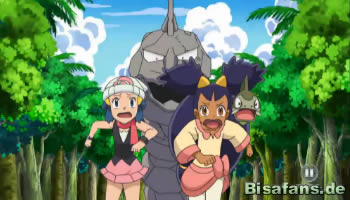 Nachdem alle gestärkt sind, beginnt die Erforschung der Insel bzw. einer Höhle, die unsere Freunde schnell finden. Es scheint übrigens, als würden sich Lucia und Lilia sehr gut verstehen, da sie den armen Ash am Eingang zur Onix-Höhle ziemlich frech anmachen. Benny tröstet Ash allerdings und die Sache ist schnell vergessen. Viel unangenehmer ist ohnehin die Anzahl an viel frecheren Onix in der Höhle, so dass unseren Freunden nichts als die Flucht bleibt. Dabei trennt sich die Gruppe und die beiden Mädels verlassen die Onix-Höhle durch einen neuen Ausgang und ohne Plinfa. Genauso wie die Jungs beschließen alle zum Strand zurückzukehren um sich neu zu sammeln, auch wenn insbesondere Ash zu gerne das besondere Onix zuerst finden möchte.