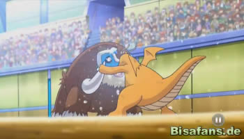 Mamutel setzt nun zu einem Bodycheck an und stürmt dazu auf Dragoran los. Lilia befiehlt erneut Ausweichen, doch Dragoran ignoriert dies und stürmt Mamutel direkt entgegen. Beide Pokémon prallen aufeinander und Dragoran kann tatsächlich den Bodycheck in der Ausführung stoppen. Lucia reagiert nun blitzschnell und befiehlt einen Eissplitter-Angriff aus kürzester Entfernung. Lilia befiehlt nun erneut ein Ausweichen, doch Dragoran weicht trotz der Befehle und der schmerzhaften Attacke keinen Millimeter zurück, sondern schleudert seinerseits das schwere Mamutel durch die Gegend!