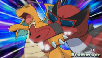 Später kann Dragoran einen Eisstrahl erfolgreich einsetzen, was dazu führt, dass Rokkaiman eingefroren wird. Ein Flammenwurf taut Rokkaiman jedoch unmittelbar darauf wieder schmerzhaft auf. Ist das die entscheidende Wende im Kampf? Nun, für Ash auf jeden Fall, denn sein Rokkaiman beginnt zu leuchten und entwickelt sich zu seiner finalen Stufe, Rabigator, weiter! Lucia prüft natürlich die Daten im Pokédex nach der Entwicklung.