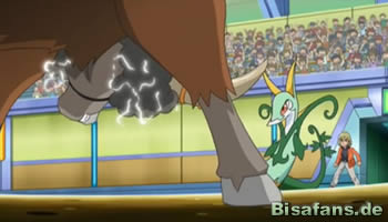 Im Kampf steckt Bisofank tapfer einen mächtigen Solarstrahl von Serpifeu ein. Das überrascht alle Zuschauer, denn scheinbar hat ihm diese Attacke nichts ausgemacht, sondern, im Gegenteil, seinen Kampfgeist geweckt! Diaz ist der erste, der erkennt, dass dies an Bisofanks Spezialfähigkeit Vegetarier liegt, die Pflanzen-Attacken in Angriffskraft umwandelt. Es folgt eine Drachenrute von Serpiroyal, doch auch die steckt Bisofank regungslos weg. Serpiroyal schaut sichtlich überrascht, doch Diaz gibt noch nicht auf und befiehlt einen Silberblick, der die Verteidigung von Bisofank schwächen soll. Mit der nun folgenden Drachenrute muss der Sieg folgen, da ist sich Diaz sicher. Doch außer Lob von Lauro für eine gut ausgeführte Attacke, gibt es den Hinweis, dass Bisofank kein normales Pokémon ist, sondern das Pokémon eines Champions. In diesem Moment schreckt selbst Diaz etwas zurück.