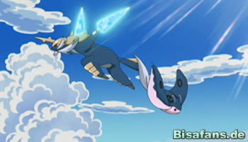 Am nächsten Morgen können Ash und Carsten Abidaya-City sowie das Meer sehen. Trotz all des Chaos haben es die beiden also doch geschafft. Gerade als sich die beiden fragen, wo die hiesige Arena ist, taucht unmittelbar vor ihnen ein Wailord mit einer Person auf dem Rücken auf. Bevor wir erfahren, was genau passiert, schwenkt die Szene zu Benny und Lilia, die sich ebenfalls in Abidaya-City befinden. Am Steg der Arena warten die beiden verzweifelt auf die Jungs, als sie ein riesiges Wailord auf sich zukommen sehen. Die beiden sind ganz schön überrascht, als sie obendrauf Ash, Carsten sowie Arenaleiter Benson sehen! Die Gruppe ist jedenfalls wieder vereint und Carsten kann gegen Benson in der Arena antreten.