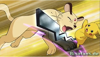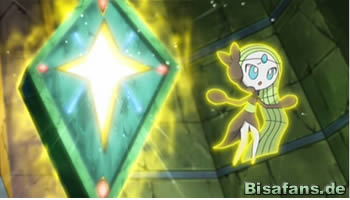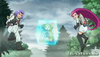 Der Plan klappt leider nur bedingt, denn wenige Schritte später spürt Pikachu eine Gefahr. Das Gefühl war richtig, denn plötzlich springt ein Snobilikat aus dem Gebüsch (was Ash mit dem Pokédex prüfen muss...). Nachdem Ash Meloetta gebeten hat, sich unsichtbar zu machen, erscheint auch der Besitzer von Snobilikat – Boss Giovanni mit Sichtbrille und auf einem Gleiter. Snobilikat greift mit Dunkelklaue an, was Pikachu jedoch erfolgreich mit einem Eisenschweif kontert. Die folgende Juwelenkraft-Attacke kommt hingegen zu überraschend und überrumpelt Ash und Pikachu. Überraschend greift sich ein Energiefeld nicht Meloetta, sondern Ash und Pikachu, die Giovanni daraufhin als Geiseln einsetzt, um Meloetta gefügig zu machen. Ein wirklich schändlicher Plan.