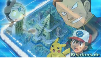Giovanni steigt in der Basis von Team Rocket mit Doktor Zager in das U-Boot und macht sich auf den Weg zum verschütteten Unterwassertempel. Wenig später ist dieser erreicht und in einer unterirdirschen Kammer steigen die Schurken mit den Geiseln aus dem U-Boot. Meloetta scheint die Kammer zu kennen, denn sie fühlt sich alles andere als Wohl. Da Giovanni jedoch Ash als Geisel hat und Meloetta nicht will, dass ihm etwas passiert, macht sie was Giovanni verlangt. Meloetta wird von einem magischen Stein angezogen und festgehalten. Wie James erklärt, müsste Meloetta nun ihr Lied singen, damit die Versiegelung zu irgendetwas aufgeht, doch da Team Rocket alle Lieder aufgezeichnet hat, spielen diese einfach die Aufnahmen ab.