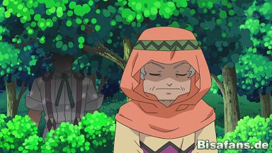 Nachdem sich unsere Freunde vorerst von Sabine verabschieden, besuchen sie die Dorfälteste, von der Lilia auch einst ihr Milza bekam. Lilia bittet sie um Entschuldigung dafür, dass sie einfach gegangen ist, doch die alte Frau lobt sie nur dafür, dass sie große Fortschritte gemacht hat und ihr Milza zeigt, dass sie sich gut um es gekümmert hat. So fragt sie Lilia, ob sie auf ihrer Reise noch andere Drachenpokémon gefangen hat und Lilia zeigt ihr und zwei weiteren Dorfbewohnern Dragoran. Dieses gerät jedoch direkt mit einem Maxax, das sich vor dem Haus der Ältesten ausruht, aneinander und die Pokémon beginnen zu kämpfen. Doch während Lilia fast in Panik gerät, bleibt die Dorfälteste ruhig und geht zwischen die beiden Drachen. Sie tätschelt erst Maxax am Bauch und drängt es zurück, ehe sie sich um Dragoran kümmert und auch es mit ruhiger Stimme und einigen Streicheleinheiten beruhigt, womit sie Ash und seine Freunde sehr beeindruckt.
