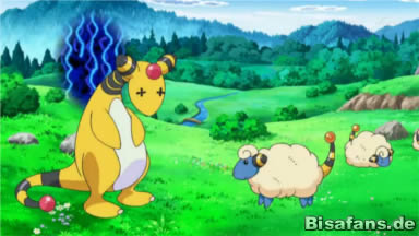 Auf ihrem Weg laufen Lilias Milza und Ashs Pikachu schon voraus und treffen dabei auf ein Voltilamm. Nachdem Ash, Lilia und Benni die zwei Pokémon endlich gefunden haben, sind sie zunächst verwundert über das Voltilamm. Nachdem sich Ash den passenden Pokédex-Eintrag angesehen hatte, taucht auch schon eine weitere Gestalt auf – aus dem Gebüsch tritt ein Schatten mit zwei roten Leuchten, die eher bedrohlich wirken. Doch als es ins Sonnenlicht tritt, erkennen sie, dass es nur ein Ampharos ist. Es sieht lieb aus. Ash benutzt erneut seinen Pokédex, während das Ampharos zu Voltilamm geht und versucht es dazu zu bringen, mit ihm zu kommen, woraufhin es von dem kleinen Schaf einen kräftigen Donnerschock abkriegt. Plötzlich taucht ein Mädchen auf, dem die Pokémon gehören zu scheinen. Sie stellt sich als „Ellie“ vor und erzählt, dass es Pokémon ihrer kleinen Ranch sein – der Dausing Ranch! Das klingt interessant, sodass Ash und Co gemeinsam mit Ellie zu der Ranch gehen.