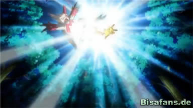 Sengo greift daraufhin mit Megahieb an, Pikachu ist viel zu kraftlos um sich zu wehren. In letzter Sekunde springt Washakwil dazwischen und blockt den Angriff ab. Pikachu besiegt Sengo daraufhin mit Donnerblitz.