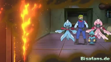 Das Pokémon zeigt auf die bereits anwesenden Pokémon Zwottronin und zwei Quabbel. Diese sind mit ihren Trainern eingetroffen. Nachdem diese mit Hydropumpe das Feuer eingedämmt haben, bringen die Quabbel die Leute, die sich noch im Haus befinden mit Psychokinese heraus. Allerdings sind es nur Holzpuppen und Ash entschuldigt sich dafür, dass er unnötig in Panik geraten ist und ruft Ottaro zurück.