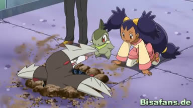 Pikachu will mit Donnerblitz Team Rocket in den Himmel schicken, doch sie weichen den Blitze aus und machen sich mit ihren Raketenrucksäcken davon. Da der Generator Feuer gefangen hat, soll Ottaro es mit Hydropumpe löschen, doch es schafft es alleine nicht. Ash ruft daher Halsey mit einen gebäudeinternen Telefon an und bittet um Hilfe, aber er und sein Team sind nun im Gebäude gefangen. Statt sich um die Evakuierung zu kümmern, will Ash ihnen helfen und Benny schlägt vor, dass Stalobor mit Schaufler nach Halsey graben soll. Doch das Feuer wird immer größer und Stalobor stößt auf eine Stelle, wo es nicht weitergraben kann. Währenddessen hält Kukmarda und eine Wache die schaulustigen Leute zurück und N fragt um Hilfe. Er bringt es zu Stalobors Tunnel und erklärt ihn, dass er mit seinen Spürsinn eine Stelle suchen soll, wo Stalobor graben kann. N übergibt die Informationen an Lilia und schafft es Stalobor zu dirigieren.