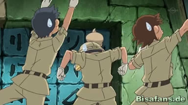 Sie gehen in eine Passage in den Ruinen, und auf dem Weg unterhalten sich die vier. Beim Professor angekommen möchten sie ihn begrüßen, doch er warnt sie, nicht näher zu treten, was mal wieder nur eine Floskel ist. Er erinnert sie lachend an die Regel Nr. 1 der "Basis von Abenteuern". Benny sagt sie auf: Man solle Menschen immer ausreden lassen. Der Professor bestätigt und bedankt sich für das Kommen der drei. Diese möchten nun wissen, was die "Entdeckung des Jahrhunderts" genau sei. So wird ihnen prompt von den Steintafeln erzählt und dass dahinter etwas liegt, was mit Reshiram zu tun hat. Dieses, sagt er, sei ein legendäres Drachenpokémon; die Flammen, die seinem Schwanz entstammen, sollen alles in Asche verwandeln.