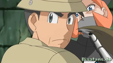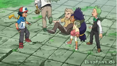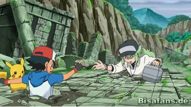 Dort angekommen sind Ash, Lila und Benny beeindruckt von der Größe und – zumindest Benny – vom "Geschmack" der Ruinen. Bei diesen arbeiten viele Pokémon und Menschen zusammen, die Gegend untersuchend. Ash meint, er würde sich freuen, wenn N das auch sehen könnte. In Nick schien diese Aussage etwas auszulösen.