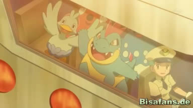 Das Schiff wird beobachtet von einem Octillery und einem Tyracroc, die sich absprechen und das Octillery schließlich die Wand des Schiffes hinaufklettert. Oben an der Reling ankommen, trifft es auf Ferkokel, das gerade den Ball, den es weggeschossen hat, aufheben will. Octillery springt dabei Ferkokel auf den Kopf und geht nachher zu einer Winde, um mit deren Hilfe Tyracroc und ein hinzugekommenes Azumarill auf das Schiff zu heben. Oben angekommen, machen sich die drei Wasser-Pokémon auf den Weg irgendwohin.