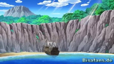 Schließlich erreicht das Boot eine Bucht inmitten der Insel, und siehe da, dort liegt auch das Piratenschiff an einem Strand! Nachdem sie an Strand gegangen sind, zerstört Pikachus neugieriges Klopfen aus Versehen einen Teil der inzwischen schon sehr mitgenommen Schiffswand. Trotz der Gefahr beschließen unsere Freunde, das Schiff zu betreten. Daraufhin etschließt Team Rocket im Barschuft-U-Boot, das Schiff zu rammen und so an die dort vermuteten Schätze zu kommen. Unsere überrumpelten Freunde entkommen rechtzeitig und Pikachu entdeckt daraufhin eine rätselhafte Tür im Fels.
