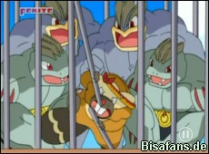 In diesem Moment sehen wir Team Rockets Heißluftballon und wie diese die vier Machomei abtransportieren wollen. Gierig wie Jessie, James und Mauzi sind, wollen sie auch Bidifas klauen. Hier reicht es Ash endgültig. Bamelin und Mogelbaum greifen an, doch leider können sie den harten Käfig nicht öffnen. Das gefangene Bidifas knackt die Metallstangen des Käfigs jedoch problemlos, so dass Pikachu den Ballon anschließend mit einer Blitzattacke zerlegen kann.