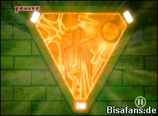 Unterdessen hat Team Galaktik mit seinem Bonzel eine Kammer in der Ruine erreicht, an dem verschiedene Elementtafeln eingesetzt werden. Daraufhin leuchtet der Raum und neben vielen Icognito erscheint auch ein antiker Würfel mit angeblich gigantischer Macht. Das Bronzel greift nun die Icognito mit einem Konfustrahl an, woraufhin es eine so große Druckwelle gibt, dass auch unsere Freunde ausserhalb der Ruinen davon etwas merken. Es kommt sogar soweit, dass unsere Freunde und ihre Pokémon in die Ruinen fallen. Team Galaktik macht sich dabei gemütlich aus dem Staub und erzählt noch etwas von der Speersäule.