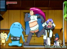 Zeitgleich sind auch Jessie, James und Mauzi von Team Rocket in der Nähe und schwären von den letzten Tagen an der Akademie, wo sie genug zu Essen und viel Spaß hatten. Bei einem All-You-Can-Eat-Essen merkt das Trio aber, dass sie mit dem leckeren Essen auch einiges an Gewicht und Masse zugelegt haben. Das darf natürlich nicht sein, da Team Rocket-Mitglieder immer schlank und sportlich sind. Entsprechend beschließen alle gemeinsam ein Training zu starten, damit die Pfunde purzeln. Auch will Team Rocket an seiner Moral arbeiten, die viel zu gut geworden ist.