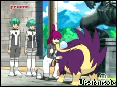 In den Ruinen kommt es nun zu einem Zusammentreffen von Team Rocket und Team Galaktik. Das ebenfalls gerade eintreffende Knakrack von Cynthia kann einen Angriff von Shnurgarst und Bronzel abwehren. Als nun auch unsere Freunde eintreffen, sind alle in den Ruinen anwesend. Zu viel für Team Rocket, die nun erneut damit drohen die Weiß-Orb zu zerstören!