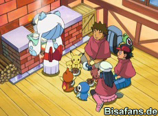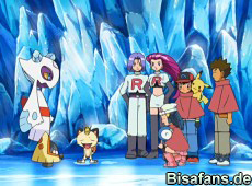 Endlich sind unsere Freunde wieder vereint und die Reise kann weiter gehen. Sie verabschieden sich von Frosdedje. Team Rocket erinnert sich daran, dass der Waffenstillstand zwischen den Knirpsen und ihnen aufgehoben sein sollte und beim Fangversuch von Pikachu stellen sie sich selbst ein Bein: rutschen auf den Schnee aus und schaffen, was nur sie schaffen können, fliegen den Sternen als Schneeball entgegen.