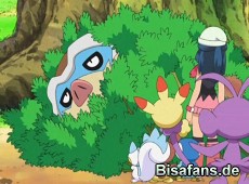 Team Rocket lauert Lucia derweil auf – sie allein ist 'leichte Beute' für die drei Antagonisten. Plinfa kann Megayanma mächtig zusetzen, Lucia bricht den Kampf jedoch rechtzeitig ab, weil das Stollos wieder in der nähe ist.