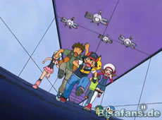 Da entdeckt Rocko einen kleinen Lüftungsschacht. Während Lyra und Lucia über die Liebe reden, kann Pikachu in den Lüftungsschacht gehoben werden. Auf diese Weise gelangt es nach draußen, zu den streitenden Plinfa und Feurigel. Sie wollen nun zum Kontrollraum und den Wärter aufwecken. Dass in diesem Moment auch Team Rocket im Kontrollraum sind und planen das Trio zu fangen, wissen sie jedoch nicht.