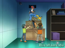 Nur knapp können sie einer Falle von Team Rocket ausweichen. Die zu Hilfe eilenden Magnetilo werden von Woingenaus Spiegelcape leider ziemlich schnell ausgeschaltet. Ash versucht in diesem Moment mit seinem Chelcarain aus dem Lagerraum auszubrechen. Als dies nicht klappt, probiert es Lyra mit ihrem Girafarig. Während Pikachu, Plinfa und Feurigel weiter vor Team Rocket flüchten, versucht Ash nun mit einem Brecheisen die Tür aufzubrechen. Lyra ist übrigens von Ash und seiner Entschlossenheit total begeistert. Ihr Freund Khoury ist da viel zurückhaltender.