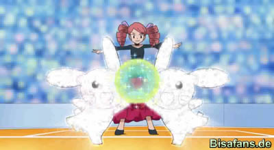 Als Nächstes geben die Elektromäuse sich einmal mehr am Tag die Rechte Hand und feuern sich selbst anschließend mithilfe von Ladestrahl in die Luft, wodurch die Attacken von Lucias Pokémon ihr Ziel verfehlen und Ursula Punkte gut macht.