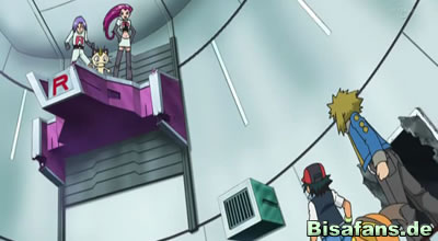 Team Rocket ist noch mit den Vorbereitungen zum Starten beschäftigt, als unsere Helden sich unsere Helden sich langsam dem Pikachu, Volkner und Ignaz an der startenden Rakete festhalten können.