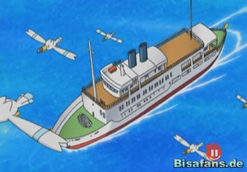 Ash, Lucia und Rocko erreichen mit der Fähre die Maiglöckcheninsel, den Austragungsort der Sinnoh-Liga. Am Hafen tummeln sich zahlreiche Trainer, doch unsere Freunde gehen zuerst zum hiesigen Pokémon Center, damit Ash sich für die Liga einschreiben Joy mit den gewohnten Glibunkel-Folgen.