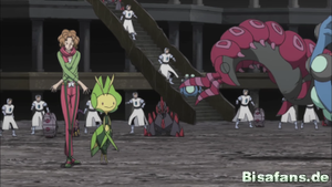 In weiterer Folge erscheinen noch weitere Pokémon. Aloes Terribark wehrt Angriffe von einigen Pokémon ab, während Kamilla reitend auf ihrem Zebritz das Geschehen betritt. Arties Matrifol tänzelt durch die Reihen der Gegner und setzt dabei Laubklinge ein, während Sandro mit seinen Kampfkünsten gegen die Rüpel selbst vorgeht. Sein Siberio schleudert ein Brockoloss gegen die Schlossmauer und Géraldines Swaroness bietet mit Luftklinge Luftunterstützung. Zum Schluss mischt auch Lysanders Maxax mit und schaltet einige der gegnerischen Pokémon aus. Somit sind beinahe alle Arenaleiter der Einall-Region versammelt.