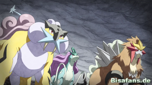 Eusin erzählt daraufhin von der Legende. Die Turmruine sei früher ein wunderschöner Turm mit prächtigen Verzierungen gewesen. Während eines Krieges brach jedoch ein Feuer im Turm aus und drei Pokémon, die sich darin befanden, wurden von den Flammen verzehrt. Nachdem der danach einsetzende Regen das Feuer des abgebrannten Turms gelöscht hatte, stieg ein regenbogenfarbener Vogel vom Himmel. Es war Ho-Oh und mit seinen Kräften schenkte es den drei Pokémon neues Leben, die fortan als Raikou, Entei und Suicune bekannt waren. Die Menschen konnten das Wunder nicht fassen und fürchteten sich vor Ho-Ohs Kraft und den wiederauferstandenen Pokémon. Sie bewarfen sie mit Steinen, aber die Pokémon wehrten sich nicht. Sie verließen stattdessen schwer getroffen von der Grausamkeit der Menschen die Stadt. Eine weitere Legende sagt jedoch, dass sich die drei wieder zeigen werden, wenn sie ihren Glauben an die Menschheit zurückerlangt haben.