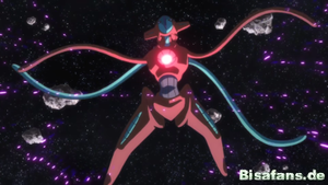 Während die Datei übertragen wird, startet Pia die Aufnahme und Udo gesellt sich zu ihr. Dort wird gezeigt, wie Mega-Rayquaza den Meteoriten zerstört und ein Kind auf dem legendären Pokémon reitet. Aus den Überresten des Meteoriten hat sich in der Zwischenzeit Deoxys materialisiert und der Trainer befiehlt Mega-Rayquaza, dass es angreifen soll. Deoxys wehrt den Hyperstrahl jedoch mit einer Steinmauer aus den Meteoritenresten ab und es wechselt daraufhin in seine Initiativeform. Der Trainer steigt von Mega-Rayquaza ab und landet auf einem Satelliten, um dem folgenden Kampf zuzusehen. Mehrere Angriffe werden zwischen den beiden Pokémon gewechselt und schließlich gelingt es Mega-Rayquaza, Deoxys Verteidigung zu durchbrechen. Der Trainer wirft einen Hyperball und fängt damit Deoxys schließlich ein.