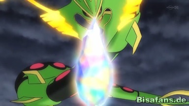 Es entbrennt daraufhin ein erbitterter Kampf zwischen den drei Legen, der erst beendet wird, als Mega-Rayquaza mithilfe von Zenitstürmer die beiden anderen Pokémon, die wieder miteinander ringen, treffen kann. Es kommt zu einer Explosion und beide Pokémon erlagen wieder ihre normale Form und verschwinden.
