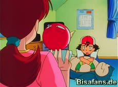 Bei der anschließenden Flucht wird Pikachu von den Habitaks angegriffen und verletzt. Ash kann es jedoch im letzten Moment noch retten. Doch dann stehen sie vor einem Wasserfall. Nach einem erfrischenden Bad gelangen sie wieder an Land. Direkt neben ihnen angelt gerade Misty. Da die Habitaks sich wieder nähern, leiht sich Ash kurzerhand einfach Mistys Fahrrad aus und rast davon…Daß Misty dies nicht gefällt, kann man ihr ansehen.