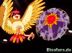 Nun schickt Ash sein Tauboga in den Kampf. Misty reagiert und wechselt ihr Sterndu zu einem Starmie. Taubogas Windstoß verpufft wirkungslos als Starmie ins Wasser abtaucht. Als Ash Tauboga einen Flügelschlag befiehlt und dieser auch erfolgreich ausgeführt werden kann, wird Starmie gegen eine Wand geschleudert und ist sehr schwer angeschlagen. Bevor der Kampf jedoch beendet werden kann taucht mal wieder Team Rocket auf…