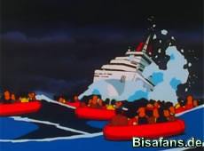 Die ganze Zeit schon tobte ein schwerer Sturm. Dieser ist jedoch nun so stark geworden, daß das Schiff umkippt und sinkt. Unglücklicherweise fallen James und Ash gerade jetzt die Pokebälle aus den Händen und beide rennen ihnen hinterher – und damit tiefer ins Schiff hinein als zu fliehen. Nun sinkt das Schiff und unsere Freunde und Team Rocket liegen ohnmächtig im Schiff. Ob sie sich retten können erfahren wir in der nächsten Folge…