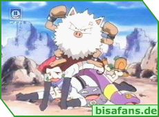 Wie so oft, taucht genau jetzt Team Rocket auf um wieder Pikachu zu klauen. Sie meinen Ash sei nun geschwächt und kein richtiger Gegner. Als das Menki aus dem Bäumen kommt und Team Rocket begutachtet, tritt James es einfach weg. Eine folgenschwere Entscheidung, da sich das Menki nun zu einem Rasaff weiterentwickelt und danach Team Rocket vermöbelt.