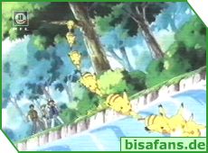 Kurz darauf besprechen unsere Freunde die Situation gemeinsam, wobei sie von einem der wilden Pikachus beobachtet werden. Als dieses jedoch in den Fluß fällt und droht den Wasserfall herabzufallen, eilen ihm alle zur Hilfe. Pikachu springt sogar ins Wasser – hat jedoch gegen die starke Strömung des Flusses auch keine Chance. Kurz vor dem Wasserfall bilden jedoch die wilden Pikachus eine Kette und halten sich gegenseitig am Schwanz fest um die beiden Pikachus aus dem Wasser zu retten. So werden die beiden erschöpften Pikachus an Land gezogen…