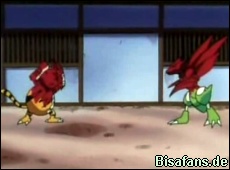 Währenddessen in der Yas Arena erzählte der Anführer, dass der Inspektor der Pokémon Liga kommen würde. Sie mussten also bis dahin die Kas Arena besiegt haben. Dasselbe erzählte natürlich auch der Anführer der Kas Arena. So kam es, dass die beiden Banden wieder anfingen zu kämpfen. Der Anführer der Yas sein Sichlor, der von der Kas sein Elektek. Alle anderen riefen ebenfalls ihre Pokémon zum Kampf. Dann ging es auch schon los. Doch diesmal waren unser Freunde drauf vorbereitet. Sie standen auf dem Dach. Ash gab ein Zeichen woraufhin sie Fässer mit roter Farbe auf die beiden Anführer runterwarfen. Das sahen nun Sichlor und Elektek. Sie hörten mit einander auf zu kämpfen und griffen jetzt ihre Trainer an. Das war also Ashs Plan, Elektek und Sichlor werden extrem wütend wenn sie Rot sehen. Ash fragte nun ob sie genug hätten und sie ihre Lektion gelernt haben. Beide sagten ja. So rief Ash Bisasam, das sogleich zwei Eimer mit roter Farbe auf Sichlor und Elektek goß. Nun sahen sich die beiden Pokémon in die Augen. Sie griffen sich gegenseitig an, so dolle dass sie sich K.O. hauten.