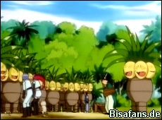 zurückkommen, bläst Ash zum Angriff. Zuerst Bisasam und Schiggy,