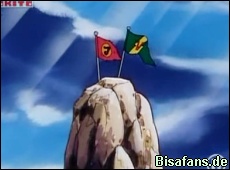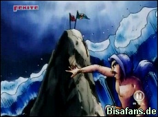 Viktor und Puka sind oben auf der Welle. Viktor packt eine Fahne mit seinem Namen drauf aus und es gelingt ihm und Puka die Fahne oben auf den Felsen neben die von Jan zu setzen.
