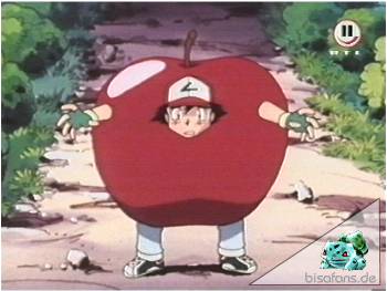 Also bleibt unseren Freunden nichts anderes übrig, als sich als Nahrung zu verkleiden. Ash bekommt ein schickes Apfel-Kostüm und soll damit Relaxo über den Berg locken. Doch dies klappt besser als erwartet und Relaxo schafft es Ash einzuholen. Glücklicherweise schmeckte Ash als Apfel nicht so gut, so daß ihm nichts passiert.