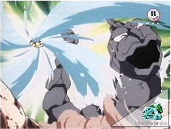 Drake schickt ein mächtiges Onix in den Kampf. Klar, daß Ash gegen ein GesteinPokémon sein Schiggy einsetzt und Pikachu zurückholt. Während Schiggy Onix mit einer Aquaknarre angreifen will, gräbt sich dieses in die Erde ein. Mit einem überraschenden Angriff von unten setzt Onix einen Klammergriff ein und hält Schiggy fest. Es scheint schon hoffnungslos, als Ash Panzerschutz und dann Hydropumpe befiehlt, die das Blatt komplett wendet. Die abschließende Schädelwumme von Schiggy gibt dem stark geschwächten Onix den Rest und bringt Ash einen weiteren Sieg in diesem Match. Es geht weiter in Runde 3 dieses Pokémon-Duells.